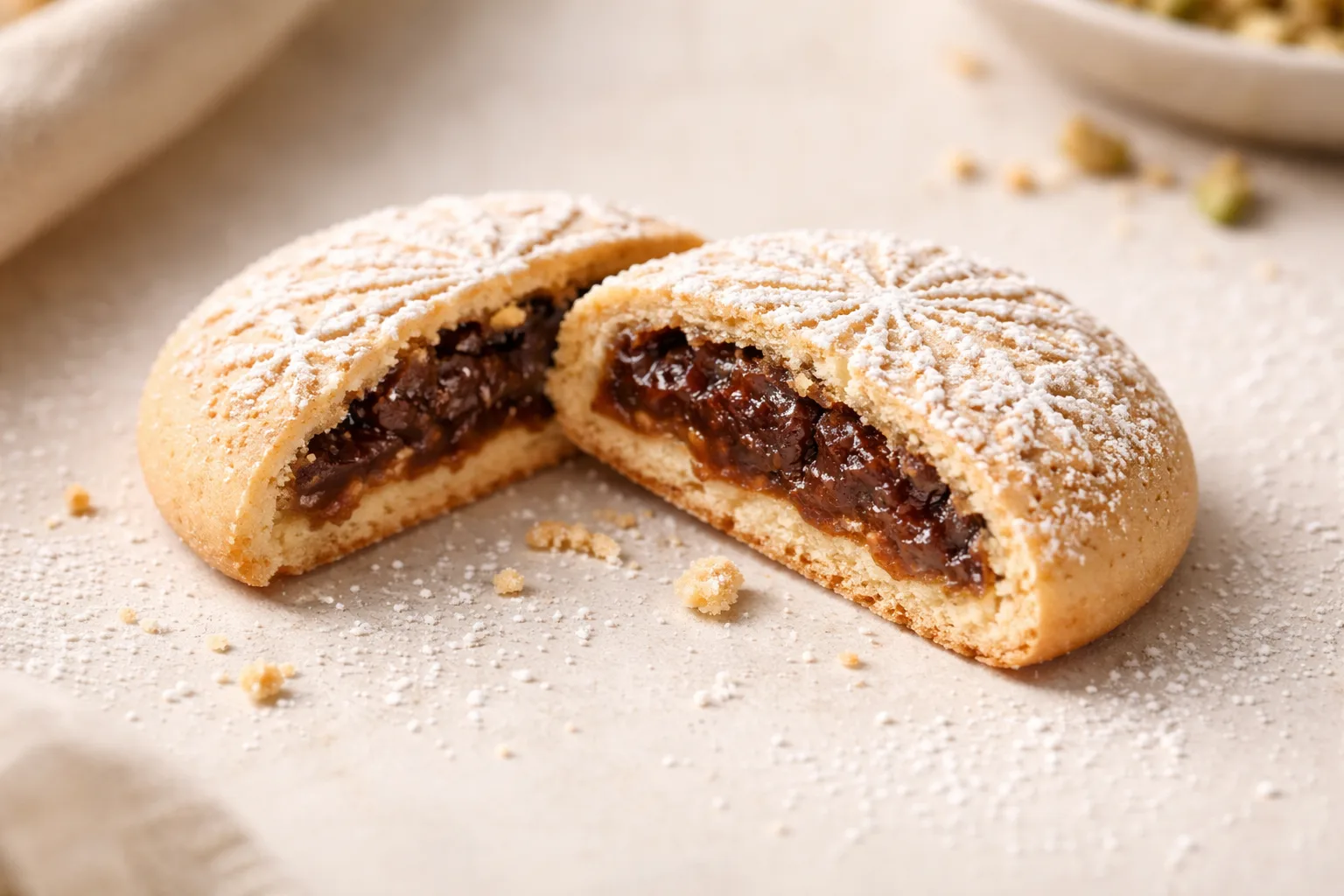 These are date-filled butter cookies from the Eastern Mediterranean — where they've been made for holidays, weddings, and the simple act of welcoming someone important into your home. The dough is butter, flour, and fine semolina, scented with rose water. The filling is pure Medjool date paste: dense, rich, with a sweetness that tastes like caramel but comes entirely from the fruit.
