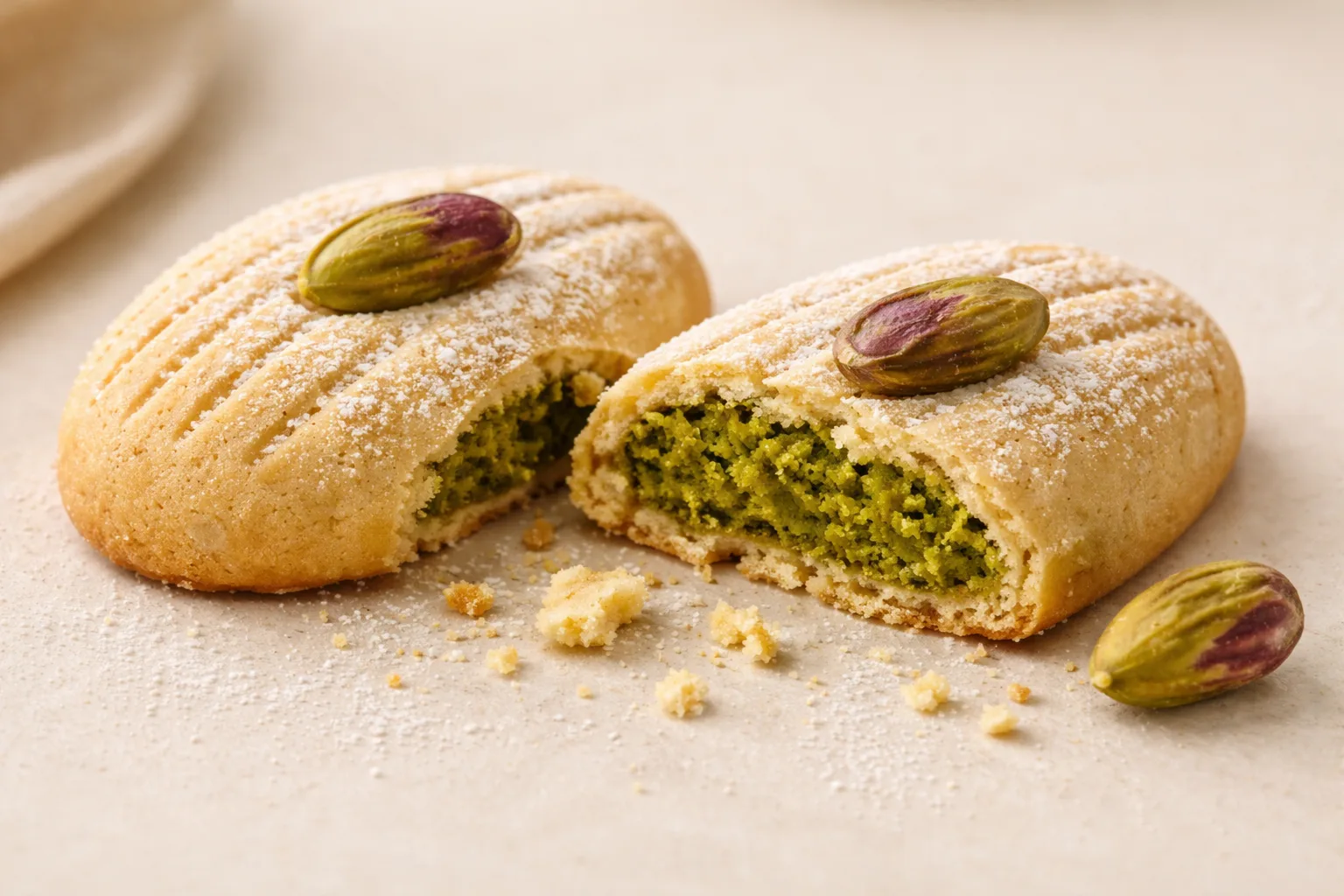 Across the Eastern Mediterranean, pistachio-filled cookies are considered the most luxurious version of the maamoul. Pistachios have always been the prestige ingredient — expensive, vivid green, and impossible to fake. A box of pistachio cookies is what you bring when you're making an impression.